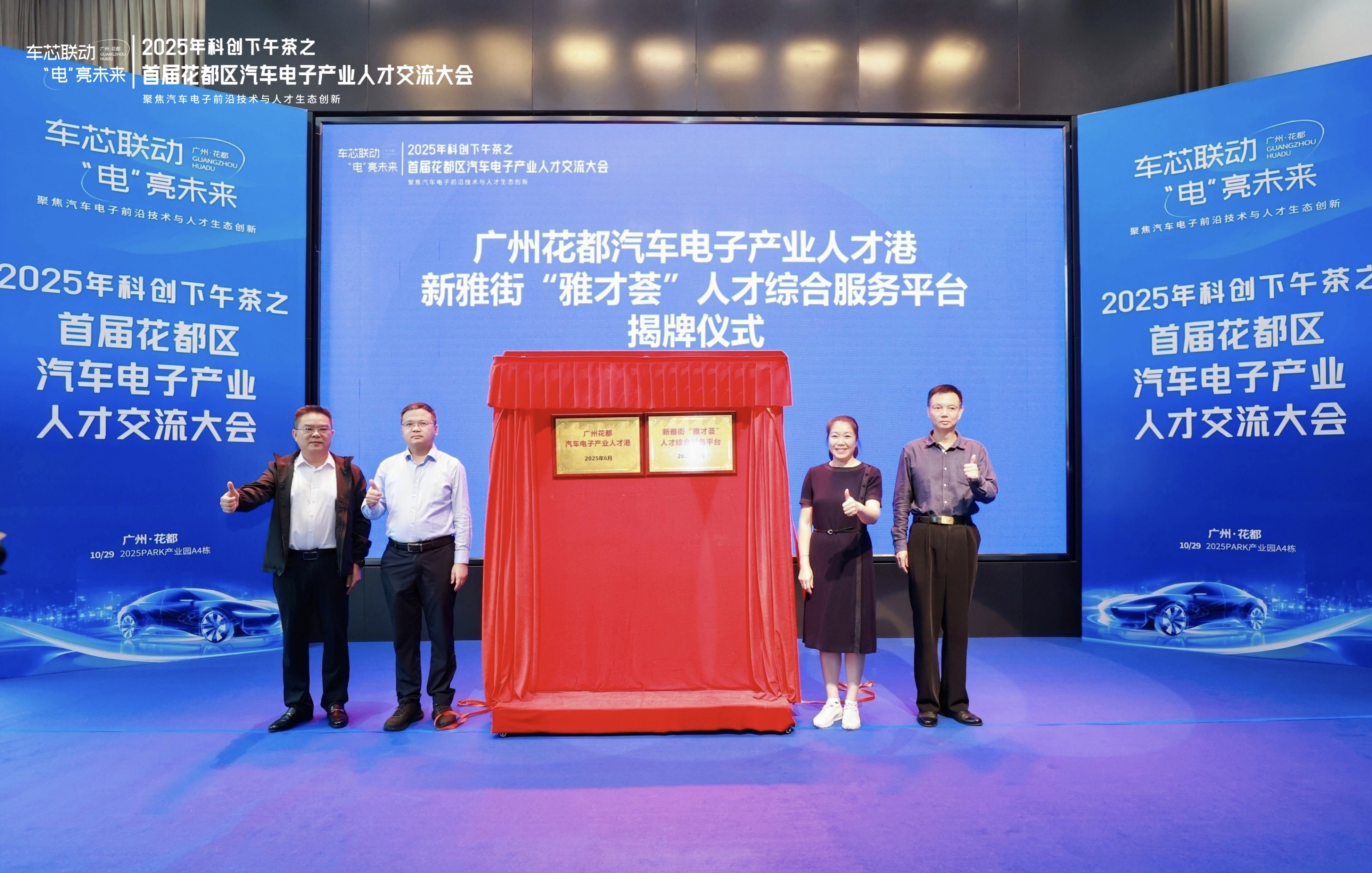 会上,花都区委组织部(区委人才办)、花都区人社局、新雅街党工委、花都汽车城管委会共同为广州花都汽车电子产业人才港、新雅街“雅才荟”人才综合服务平台揭牌,新雅街、汽车城管委会作为花都区汽车电子产业的重要承载区,聚集了东风日产、国光电器、马瑞利等汽车电子龙头企业,人才平台将为汽车电子产业提供产研交流的综合平台,为汽车电子产业人才深度共创共融打造链接桥梁,在构建花都汽车电子产业人才高地上迈出实质性一步。
