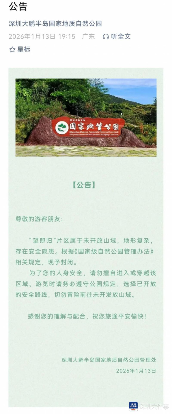 此前,该区域连续发生多起徒步者失联并最终遇难的悲剧。据深圳大鹏半岛国家地质自然公园2025年10月统计,自2023年以来,公园管理处已参与救援行动229起。许多游客因体力不支、缺水、迷路或天黑被困而求助。公园提示,独自闯入未开放区域的行为是将自身置于极大的危险之中。