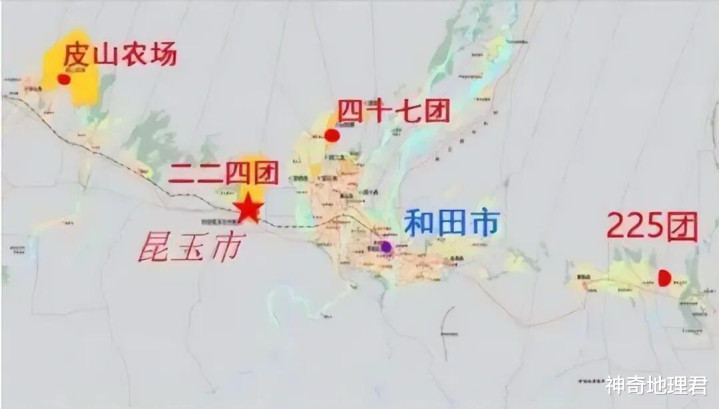 昆玉不是传统城市,而是新疆生产建设兵团第十四师打造的 “师市合一” 城市,是全国第九座兵团城市。它的 “碎片化” 版图,全是老一辈兵团人的坚守换来的:当年老兵们响应号召,在昆仑山北麓、塔克拉玛干沙漠南缘的荒野上,分散在不同区域屯垦戍边,建起一个个农牧团场。皮山农场、47 团、一牧场、224 团、225 团这些星星点点的据点,后来就组成了昆玉市的核心版图。